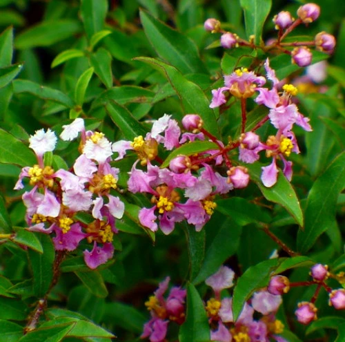This small shrub has arching dark brown stems with green leaves and pink flowers followed by red berries throughout the year. Excellent bonsai or house plant specimen. The creeping stems and sometimes exposed roots can create really interesting shapes. The Dwarf Barbados Cherry is a small tree or shrub that grows up to 15 feet in height in the dry deciduous forest and can be found growing wild and under cultivation on the sandy soils throughout Northeast Brazil. It is native to the West Indies and is also found in northern South America, Central America and Jamaica. Acerola is the fruit of the tree. It is bright red and 1 to 2 cm in diameter with several small seeds and has an appearance similar to the European Cherry. Acerola is also known as “Antilles Cherry” or “Barbados Cherry.” The mature fruits are juicy and soft with a pleasant tart flavor and they contains about 80% juice and a large amount of vitamin C as well as iron, calcium and phosphorous.
