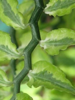 Devils Backbone is a moist shrub with zigzagged stems native to dry tropical forests of Florida, Mexico, the Caribbean, Central America, and northern South America. Pedilanthus flowers, variously described as shaped like slippers, red birds, ducks, or even cow skulls, are only open at the tip. Pedilanthus, literally slipper flower are members of the Euphorbiaceous, but the 15 or so species are unique enough to have their own branch or the family. This subtropical succulent is a distant relative of the well-known Christmas poinsettia. The plant grows from a few inches to 3 or 4 feet tall and 2 to 3 feet wide. It has 1 to 3 inch long leaves. The variegated form takes on this pinkish tint during cooler weather. It will grow outdoors in hot, humid regions. Indoors, you’d want to give this Central American member of the Euphorbia plant family really bright light and warm conditions. Water when dry. Also know as Red Bird Cactus, Christmas Candle, Japanese Poinsettia, Twenty-something, Jacob’s Ladder.
