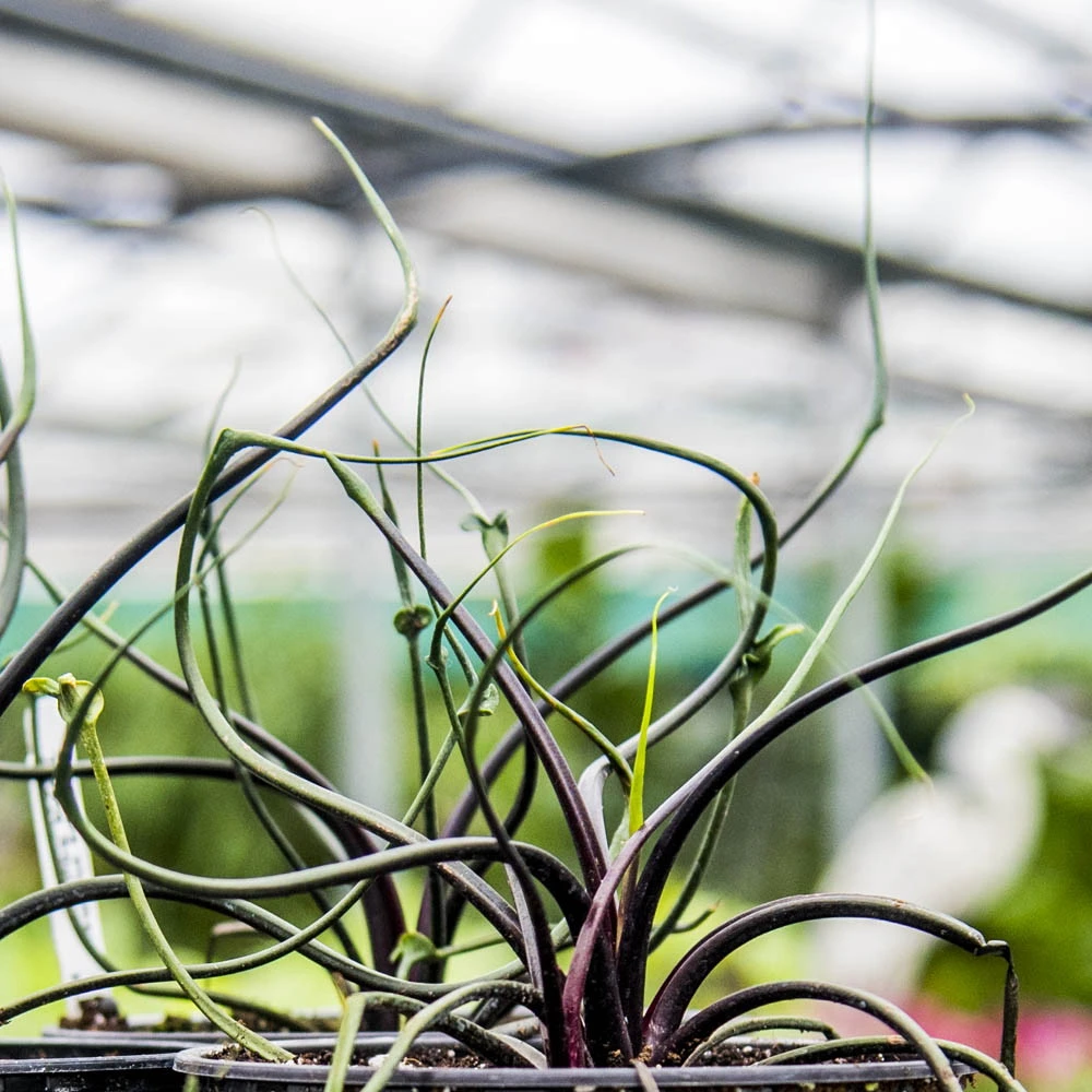 Alocasia ‘Flying Squid’ only grows to around 1 foot at its mature height! It is one of the smallest Alocasias and one of the most unique, with squid-like petioles and extremely tiny leaves at the end of each petiole.