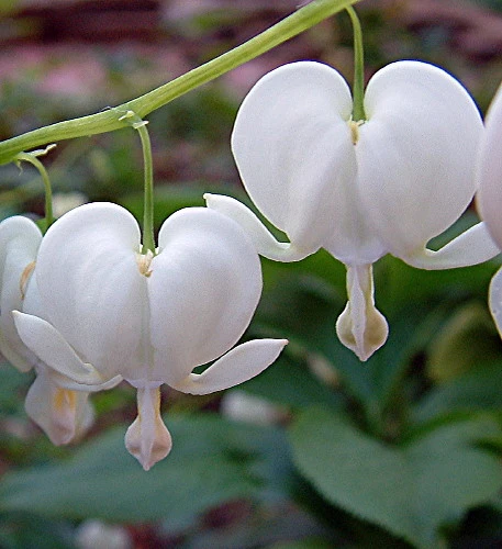 DICENTRA: The common name of this plant, bleeding heart, comes from the heart-shaped flowers which have a longer inner petal that extends below the ‘heart’. Pendulous flowers on slender stems grow from clumps of fernlike foliage in the spring. The flowering season is from early spring to mid summer .