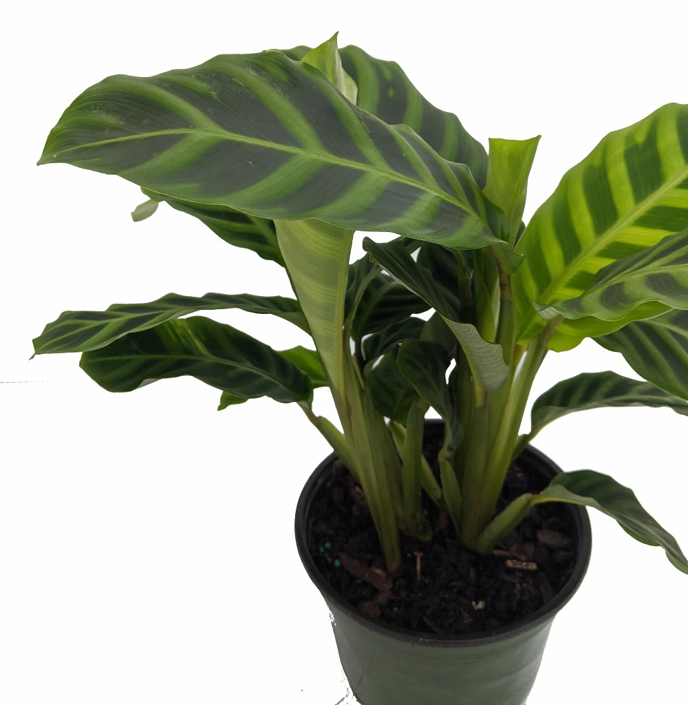 Grown for its velvety-looking leaves, Zebra Plant Calathea has light green leaves with distinctive dark green striping throughout the entire leaf and a light green central leaf vein. The underside of the leaf is purple. Native to Brazil, Calathea Zebrina thrives in warm temperatures, high humidity and indirect, dappled light.